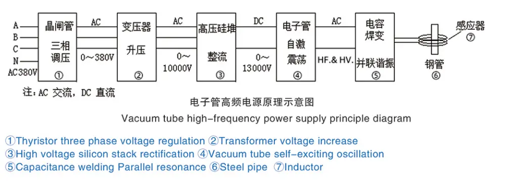 Սովորական արդյունաբերական AC (եռաֆազ չորս լարերը 380V/50HZ Չինաստանում) վերածվում է կարգավորվող AC-ի, որը տատանվում է 0-ից մինչև 380V (հաճախականությունը անփոփոխ) թրիստորի AC լարման կարգավորիչի միջոցով, այնուհետև բարձրանում է մինչև մոտ 10000V բարձր լարման, այնուհետև փոխակերպվում է բարձր հաճախականությամբ: Լարման ուղղիչի միացում տասնյակ հազարավոր բարձր լարման DC-ի, այնուհետև վակուումային խողովակով տատանվում է դեպի HF և HV հոսանք, այնուհետև LC զուգահեռ ռեզոնանսի միջոցով ուժեղացնում է տատանվող հոսանքը, և լարման նվազեցումից հետո մատակարարվում է պողպատե խողովակների և այլ աշխատանքային մասերի ջեռուցման համար օգտագործվող ինդուկտորին: