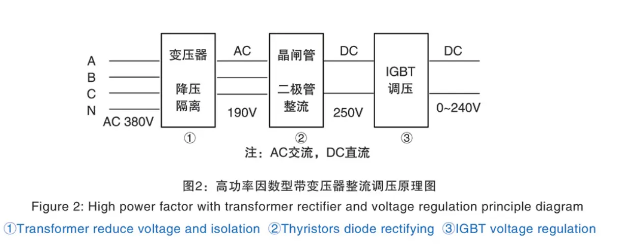 1. Դասակարգվում է ուղղիչ լարման կարգավորման միջոցով. թրիստորները (SCR) կարող են օգտագործվել միաժամանակյա ուղղման և լարման կարգավորումն ավարտելու համար, կամ նախ օգտագործել դիոդ կամ թրիստորներ ուղղող, այնուհետև օգտագործել IGBT կարգավորող լարումը: Օգտագործեք IGBT կարգավորող լարումը սարքավորումների գործոնը բարելավելու համար: կարող է խնայել էլեկտրաէներգիան և հետագայում բարելավել եռակցման որակը: